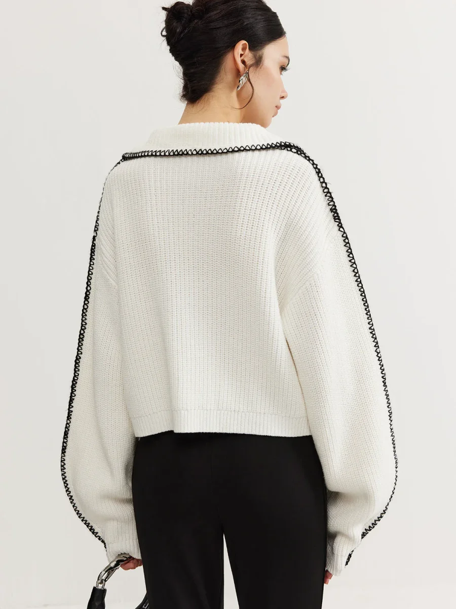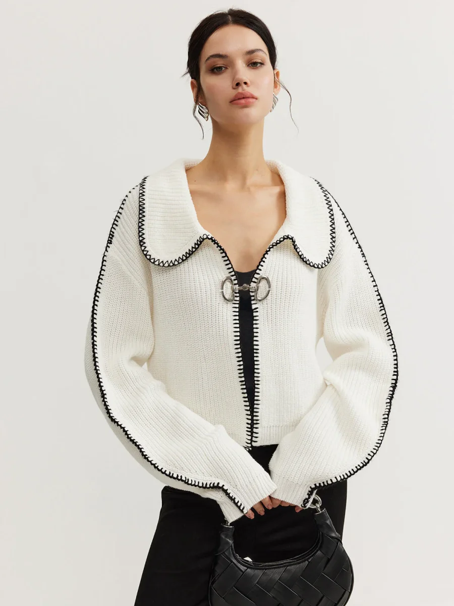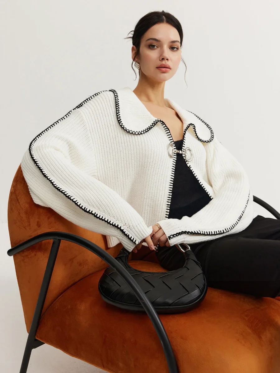 White Contrast Cardigan | Oversize Collar | Chic & Original