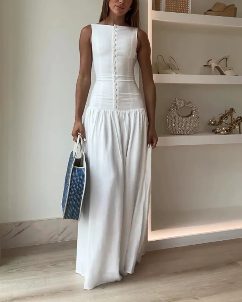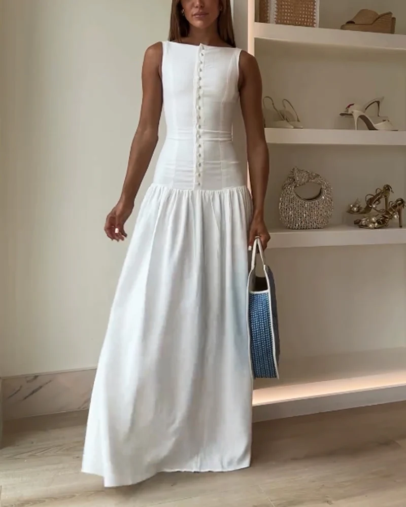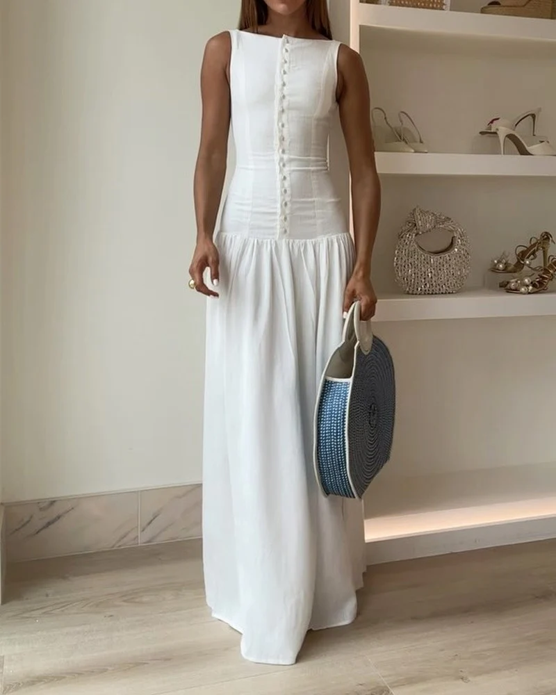 This sleeveless white linen dress with delicate buttons is the perfect definition of minimal chic.