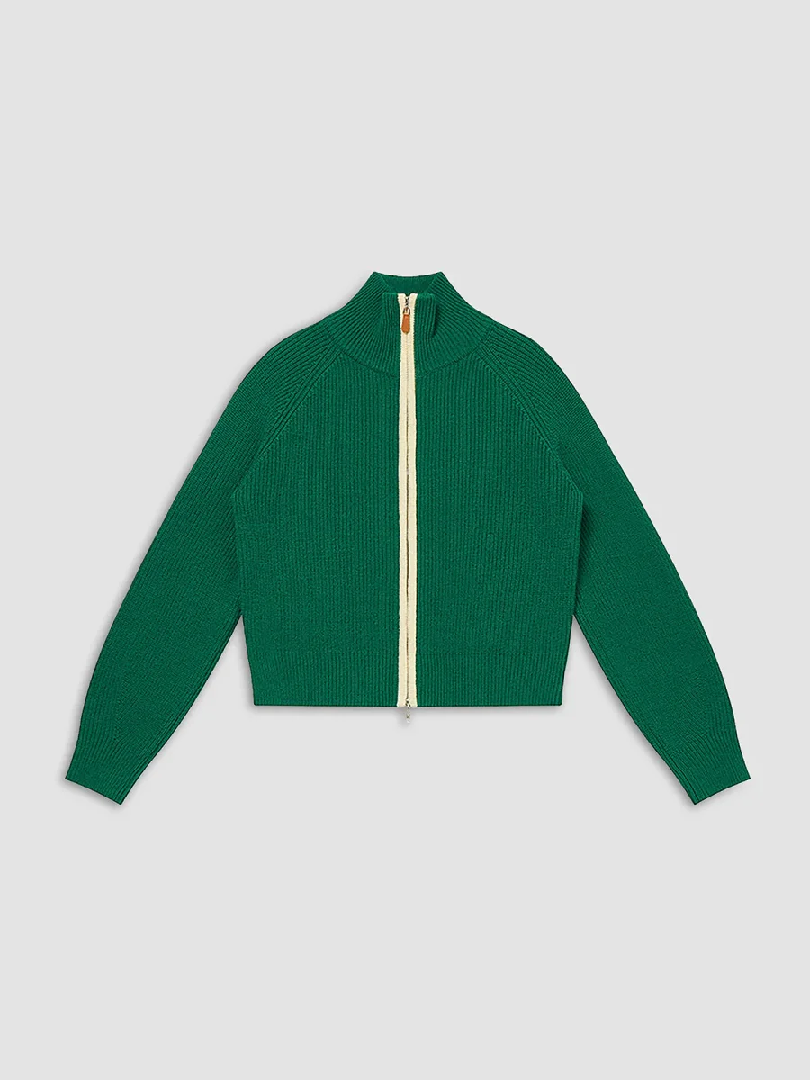 This bright green cardigan with contrasting zip fastening is the perfect piece to energize your seasonal looks.
